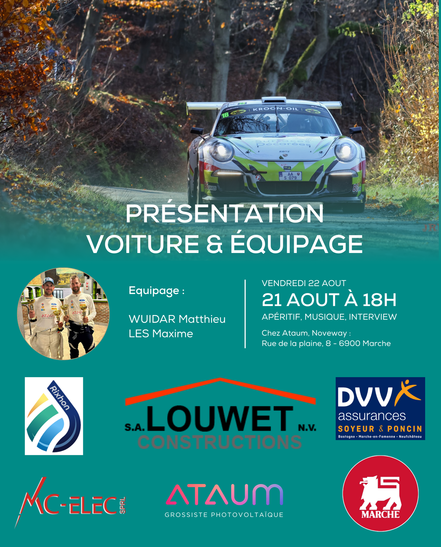 Nous avons le plaisir de vous convier à une soirée exclusive à l’occasion de la présentation officielle de notre équipage et de la Porsche engagée au Rallye de la Famenne, qui se déroulera le 23 août 2026.